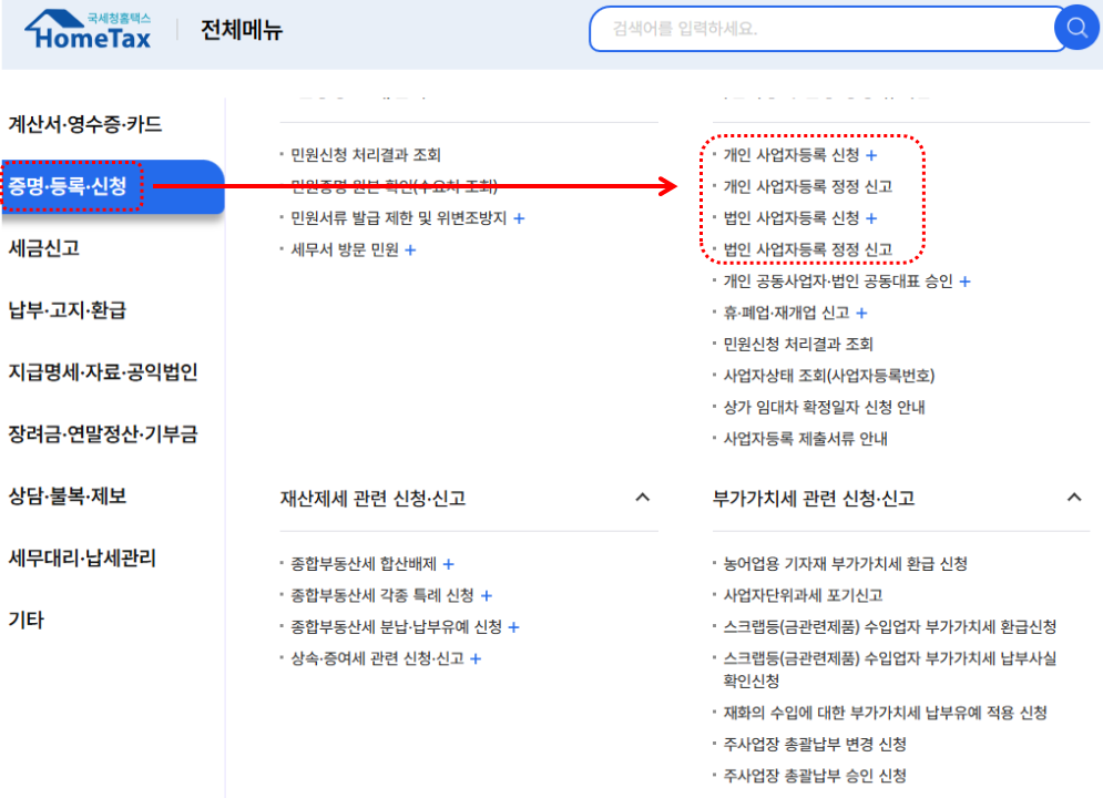 2️⃣ [신청/제출] → [사업자등록 신청] 클릭