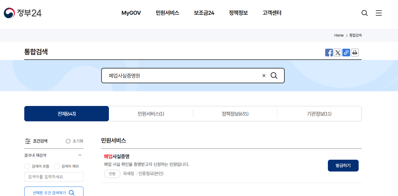 정부24에서도 폐업사실증명원을 신청할 수 있어요.